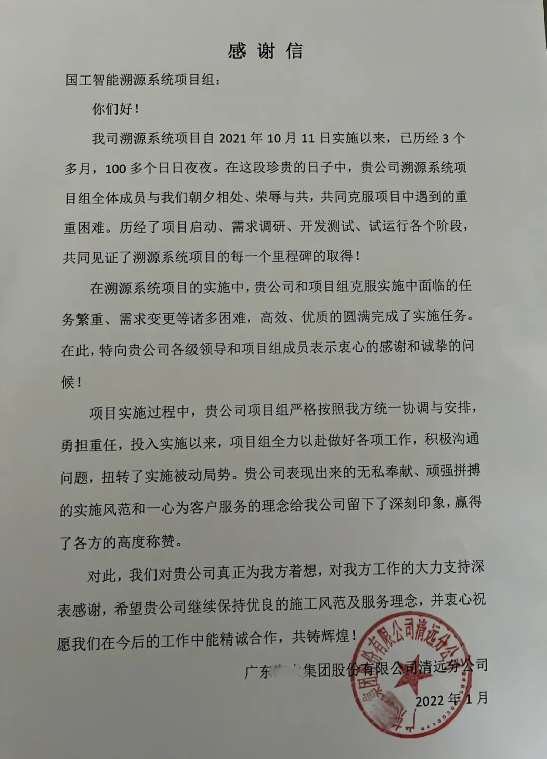 近期,國(guó)工智能收到了一封來(lái)自廣東某千億級(jí)上市公司熱情洋溢的感謝信,主要對(duì)公司各級(jí)領(lǐng)導(dǎo)及溯源系統(tǒng)項(xiàng)目組成員的全力支持和協(xié)助表示感謝,對(duì)他們勤奮敬業(yè)、踏實(shí)務(wù)實(shí)的工作精神,無(wú)私奉獻(xiàn)、頑強(qiáng)拼搏的實(shí)施風(fēng)范和一心為客戶服務(wù)的理念表示真心的感謝,并表示愿與國(guó)工智能在今后的智能化改造工作中可以精誠(chéng)合作,共鑄輝煌!
