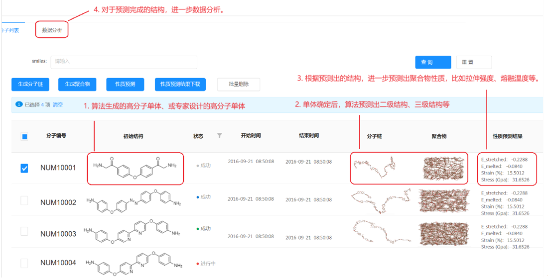 目前常規(guī)的高分子材料方法依賴于實(shí)驗(yàn)試錯(cuò)法,即使通過將量化計(jì)算方法、計(jì)算機(jī)建模和人工智能結(jié)合起來,開發(fā)了高分子材料研發(fā)平臺(tái),覆蓋單體分子篩選,聚合后分子量預(yù)測,力學(xué)性能預(yù)測和工藝優(yōu)化等環(huán)節(jié),填補(bǔ)了高分子研發(fā)工具的空白。
