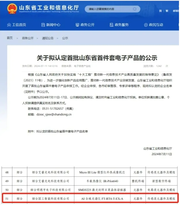 2024年7月11日,山東省工業和信息化廳公示首批山東省首件套電子產品,全省共有73項產品入選。作為煙臺上榜的三家企業之一,國工智能AI全域光譜儀成功入選。