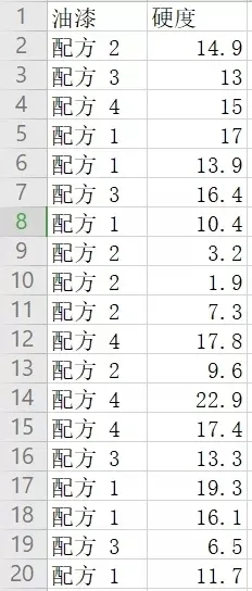 某化學工程師想要比較四種油漆混料的硬度。每種油漆混料取六份樣品涂到一小塊金屬上,待金屬塊凝固后再測量每種樣品的硬度。為了檢驗均值是否相等,并評估均值對之間的差分,分析師配合使用單因子方差分析和多重比較。所以該化學工程師通過對影響質量的因素方面的數據統計,得出了下列數據集合(部分):