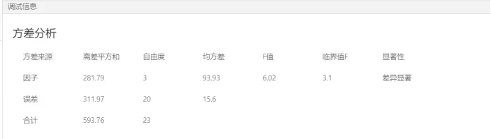 我們可以得到的結論是油漆混料的硬度明顯不同。據此得出的結論是油漆的配方對油漆混料后的硬度有顯著影響,因為單因素方差分析只針對一個因素,所以得出的結果有限,等我們拿到這個數據之后可以在數據大腦平臺中進行更進一步的分析,從而可以分析配方的具體哪幾種因素對硬度影響較大。