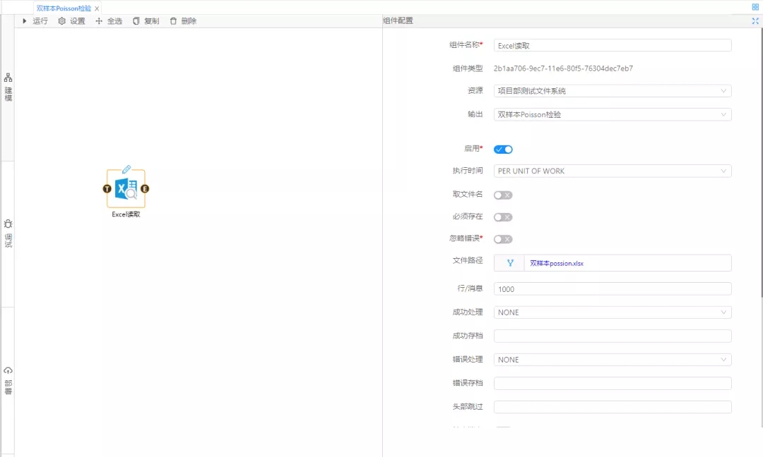 再通過拖拽的方式將雙樣本Poisson率檢驗分析組件與Excel讀取鏈接到一起。使用集成好算法的雙樣本Poisson分析組件進行數據的Poisson分析處理,對組件參數進行設置,因素字段配置為factor,結果值配置為檢驗結果result,顯著性水平設置為0.05,單擊運行,從調試面板中查看分析結果。