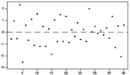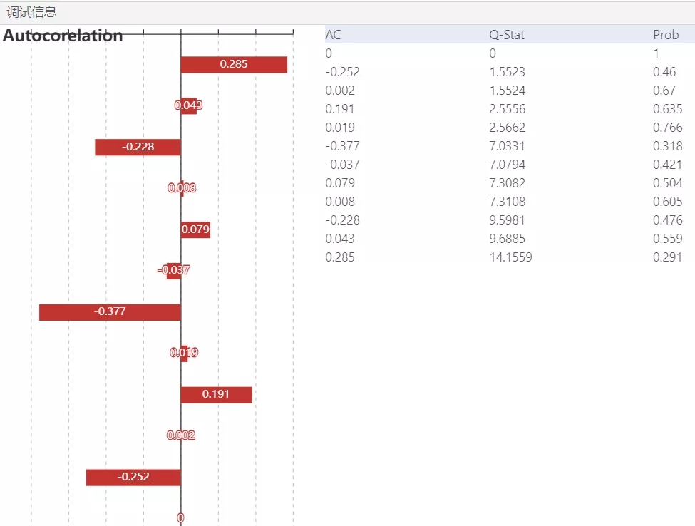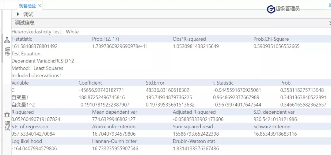 根據(jù)圖11可知,懷特檢驗統(tǒng)計量的值為1.052,它也服從自由度為2的卡方分布,在0.1的顯著性水平下,其臨界值=4.605,懷特檢驗統(tǒng)計量值<臨界值,接受原假設(shè),該殘差序列存在方差相等的情況。