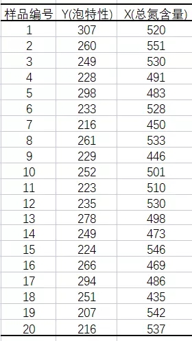 化工、釀造等裝置性行業(yè)的過程控制,往往是多變量共同作用。為了做好過程控制,實現(xiàn)“以因素管理結(jié)果",我們運用回歸分析的統(tǒng)計技術(shù)尋找規(guī)律,并用于生產(chǎn)過程控制。例如,啤酒釀造過程中成品啤酒的泡特性(秒),是直接關(guān)系到啤酒口感的技術(shù)要求。技術(shù)和經(jīng)驗表明中間產(chǎn)物的總氮含量X對于需要滿足的泡沫時間Y (秒)有影響。數(shù)據(jù)如下: