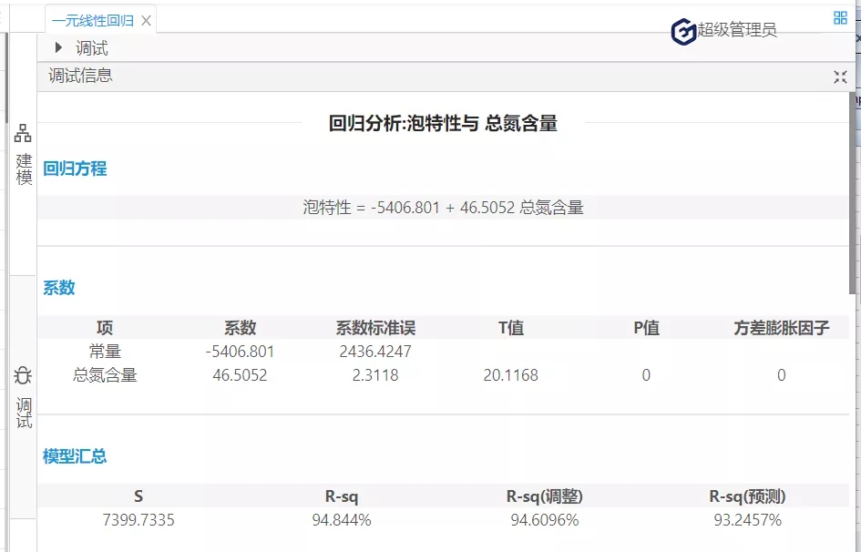 在下一批生產(chǎn)中,若X(總氮含量)=130,則Y(泡特性)的預(yù)測值=-5406.801+46.51*130=639.3(秒),以此類推,能夠預(yù)測到未來若干次生產(chǎn)中的成品啤酒的泡特性,可通過降低總氮含量等措施控制啤酒的泡特性,從而實現(xiàn)生產(chǎn)控制,實現(xiàn)效益最大化的目標(biāo)。(具體預(yù)測及回歸模型含義國工數(shù)據(jù)大腦多元線性回歸在化學(xué)研發(fā)成本的預(yù)測一文)
