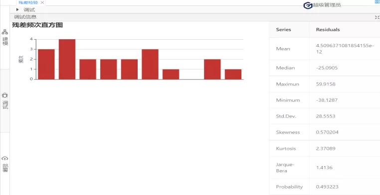 接下來,進行殘差檢驗的第二個方面:殘差序列正態(tài)性檢驗。(原假設(shè):序列服從正態(tài)分布)在診斷方法下拉列表選擇:Histigram-Normality-Test;如圖3: