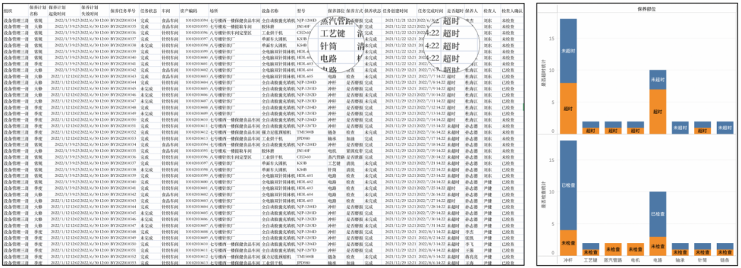 這還并不能體現(xiàn)出來可視化的最大價(jià)值,再回答一個(gè)問題:“保養(yǎng)部位中超時(shí)的多少是否與檢查人確認(rèn)有關(guān)?”針對(duì)這個(gè)問題通過表格給出答案已經(jīng)非常具有挑戰(zhàn)了,通常需要經(jīng)過編程或SQL來輔助完成計(jì)算的工作,但是類似這樣的問題會(huì)有很多,如:不同部門在不同車間中設(shè)備保養(yǎng)狀態(tài)與生產(chǎn)產(chǎn)量之間的對(duì)比情況如何?