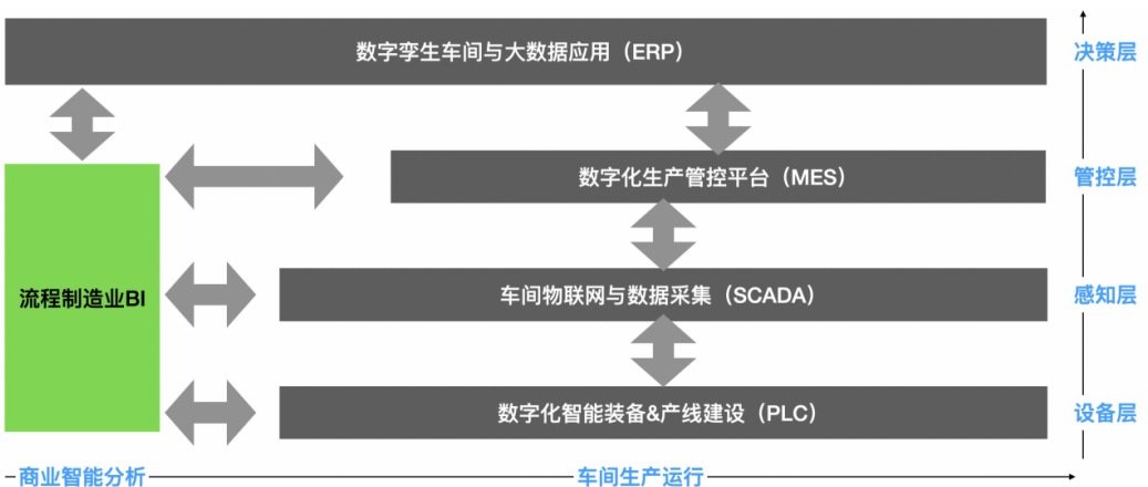 盡管流程制造業(yè)在自動(dòng)化向數(shù)字化、智能化轉(zhuǎn)型過程中使用的系統(tǒng)或技術(shù)不斷更新迭代,但其與BI在數(shù)據(jù)存儲(chǔ)、處理、分析、可視化及預(yù)測(cè)上的融合并不明顯,圍繞生產(chǎn)過程使用的各個(gè)系統(tǒng)(如:PLC、SCADA、MES等)和標(biāo)準(zhǔn)化的數(shù)據(jù)應(yīng)用產(chǎn)品(如:數(shù)據(jù)庫、ETL等)在面向流程制造業(yè)的使用過程中存在以下問題: