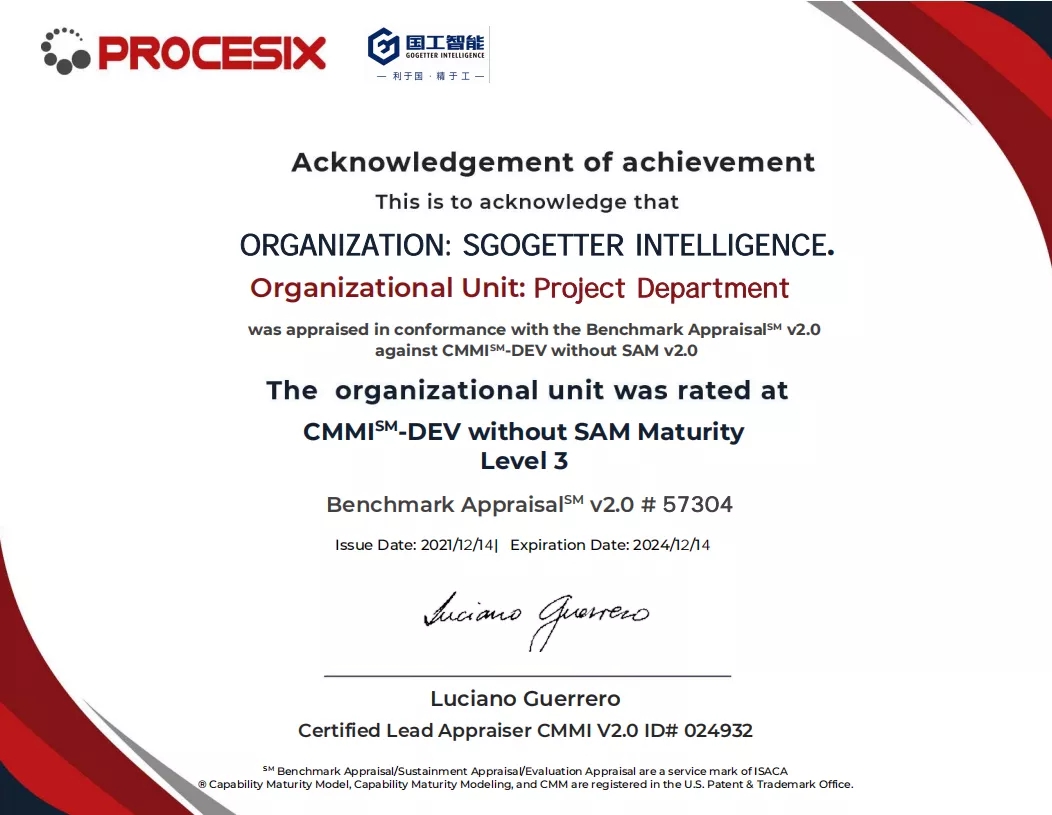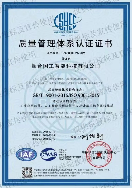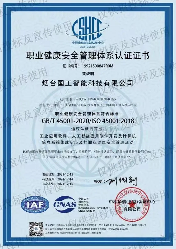 2021年12月中旬,煙臺(tái)國(guó)工智能科技有限公司正式獲得ISO 14001環(huán)境管理體系認(rèn)證證書(shū)、ISO 9001質(zhì)量管理體系認(rèn)證證書(shū)以及ISO 45001職業(yè)健康安全管理體系認(rèn)證證書(shū)。同期獲得了軟件能力成熟度模型集成(CMMI:Capability Maturity Model Integration)三級(jí)認(rèn)證證書(shū)。標(biāo)志著國(guó)工智能在智能制造行業(yè)的規(guī)范化和標(biāo)準(zhǔn)化管理達(dá)到新的水平。