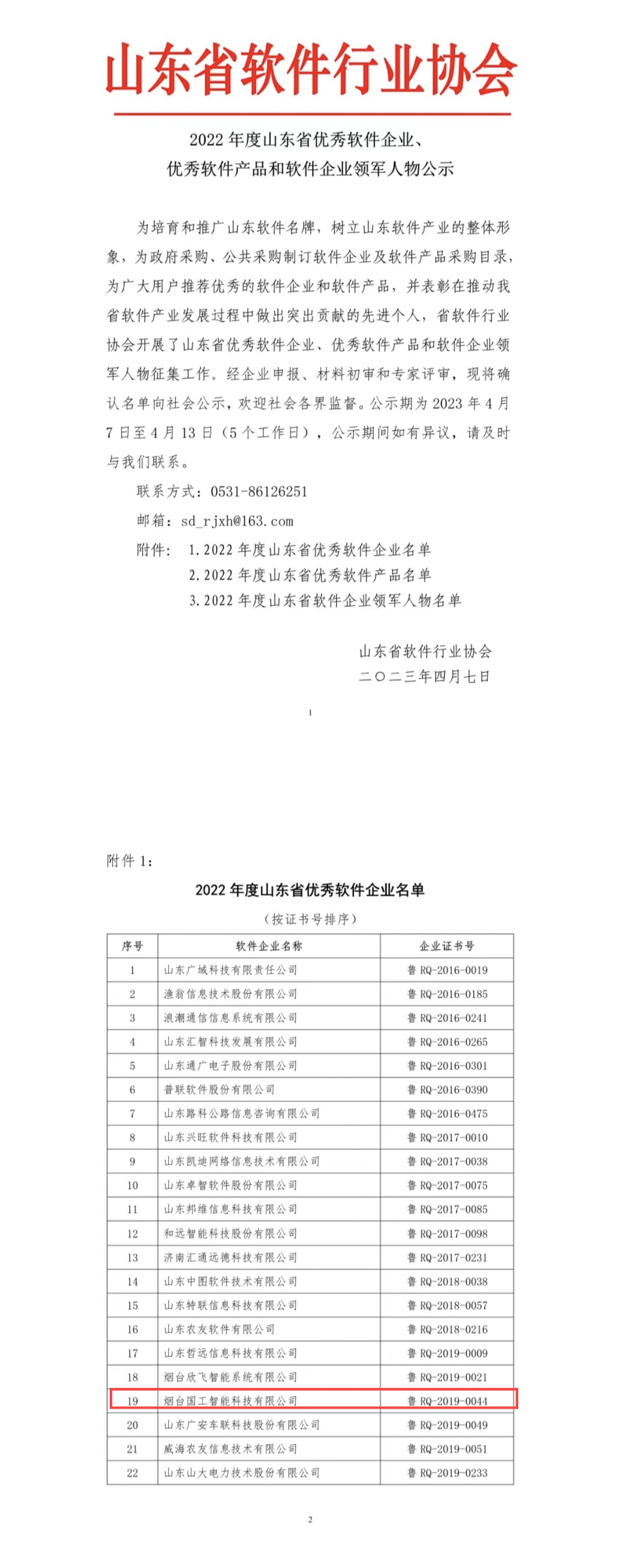 日前,山東省軟件行業(yè)協(xié)會發(fā)布《2022年度山東省優(yōu)秀軟件企業(yè)、優(yōu)秀軟件產品和軟件企業(yè)領軍人物公示》,煙臺國工智能科技有限公司被授予“山東省優(yōu)秀軟件企業(yè)”。